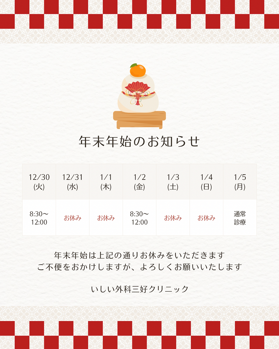 年末年始休診のお知らせHEIWA SOTOMURA2025年11月26日読了時間: 1分12月30日(火)午後 ~ 1月4日(日) の間は年末年始のため休診とさせていただきます。なお、1月2日(金)は休診期間中ですが、午前のみ診療いたします。